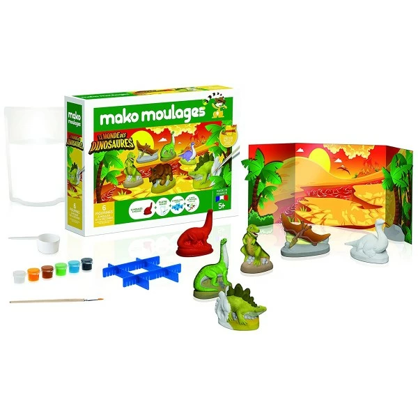 - Contenu du coffret : 1 sachet de plâtre de 800g, 6 moules dinosaure, 8 croisillons, 6 mini pots de peinture, 1 pinceau, 1 décor de jeu 3D