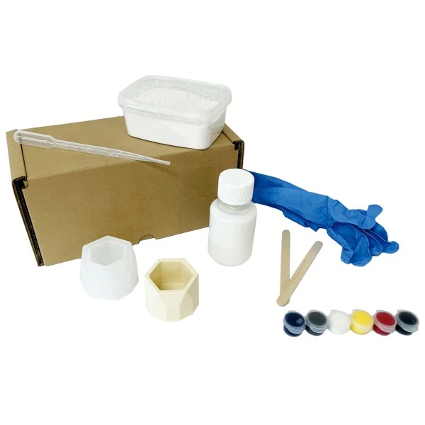 Ce kit est très complet et vous permettra d’avoir tout le matériel nécessaire à la confection de petits pots de forme Hexagonal, comme un moule, les éléments à mélanger, des gants, etc…